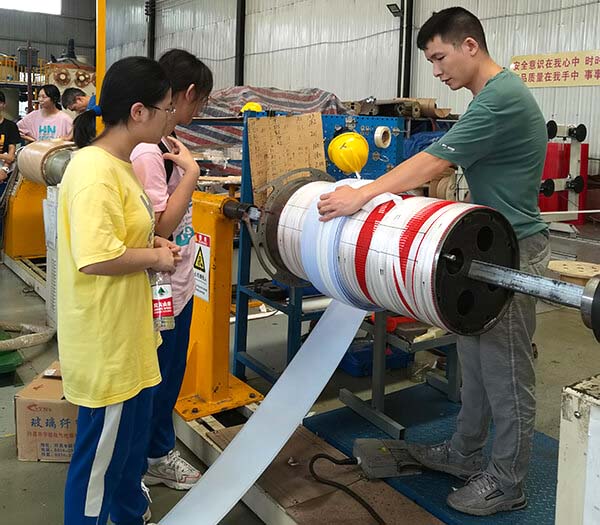 在繞線區(qū),同學(xué)們饒有興趣地向變壓器師傅們學(xué)習(xí)變壓器線圈的繞制并提出各種問(wèn)題,指導(dǎo)老師也非常耐心地解答同學(xué)們的提問(wèn)。