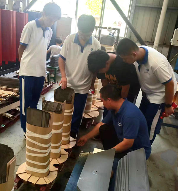 經(jīng)過(guò)簡(jiǎn)短的安全培訓(xùn)后,帶領(lǐng)同學(xué)們進(jìn)入車間,依照變壓器生產(chǎn)中的繞線、澆注與浸漆、組裝和測(cè)試等工藝流程開(kāi)始參觀學(xué)習(xí)。